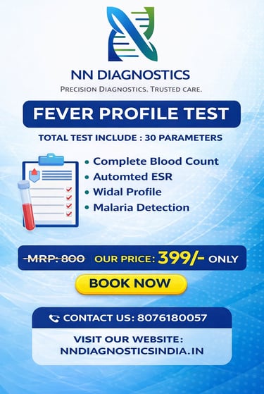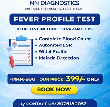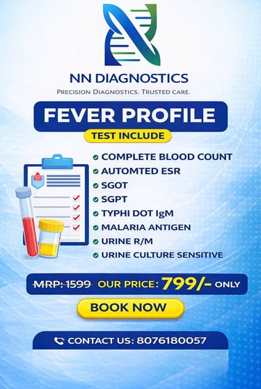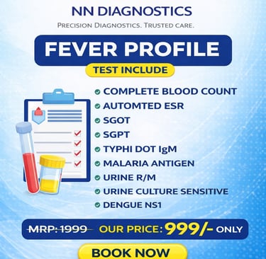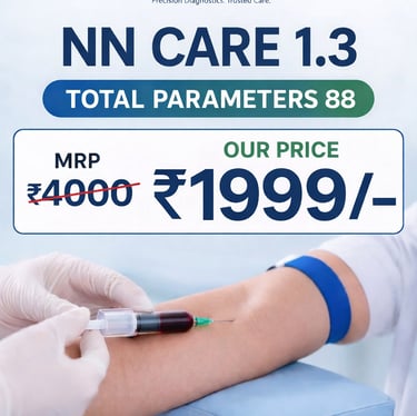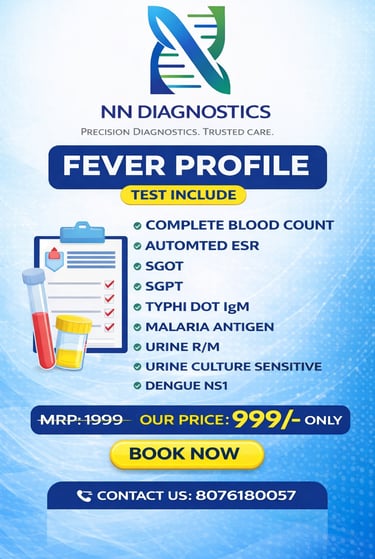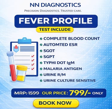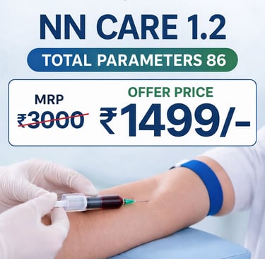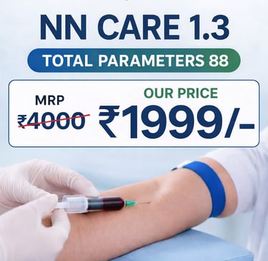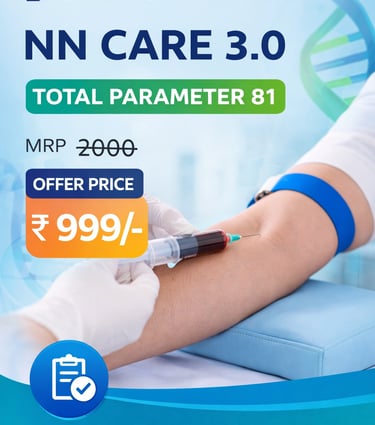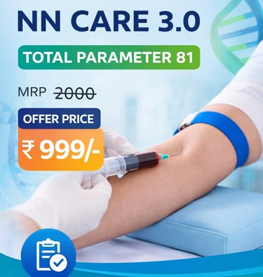 NN CARE 3.0, NN CARE 1.2, NN CARE 1.3, COMPLEHENSIVE FULL BODY PROFILE, GYM PACKAGE COMPLETE BLOOD COUNT, AUTOMATED ESR, LIVER FUCTION TEST, KIDNEY FUNCTION TEST, FULL BODY PROFILE, THYROID FUNCTION TEST, TSH (ULTRA SENSTIVE), T3, T4, PCOD PROFILE, ANTE NATAL SCREENING, AMH, HIV, ANTI HCV, HBSAG, SERUM ELECTROLYTE, IPTH, WIDAL PROFILE, DEGUE NS1, DENGUE IGG & IGM, TYPHI DOT IGG& IGM, FEVER PROFILE, FEVER SCREENING